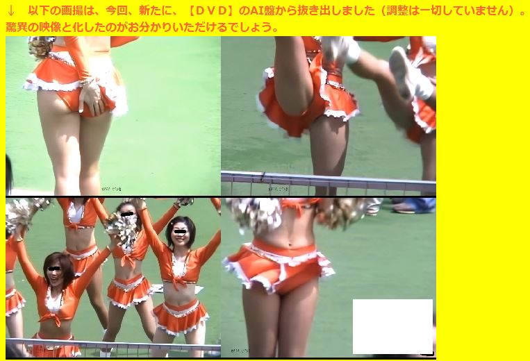 懐かしのXリ*グ、今回は、既に“アイドルチアガール・コレクション”“チアスマイルが呼んでるよ”シリーズetc. でもリリース済み、欧米では“sun stand”社と呼ばれているとかいないとか のチームの、マニア&ファンに大受けのオレンジ・ミニユニフォームでの絶頂期の映像を再び。